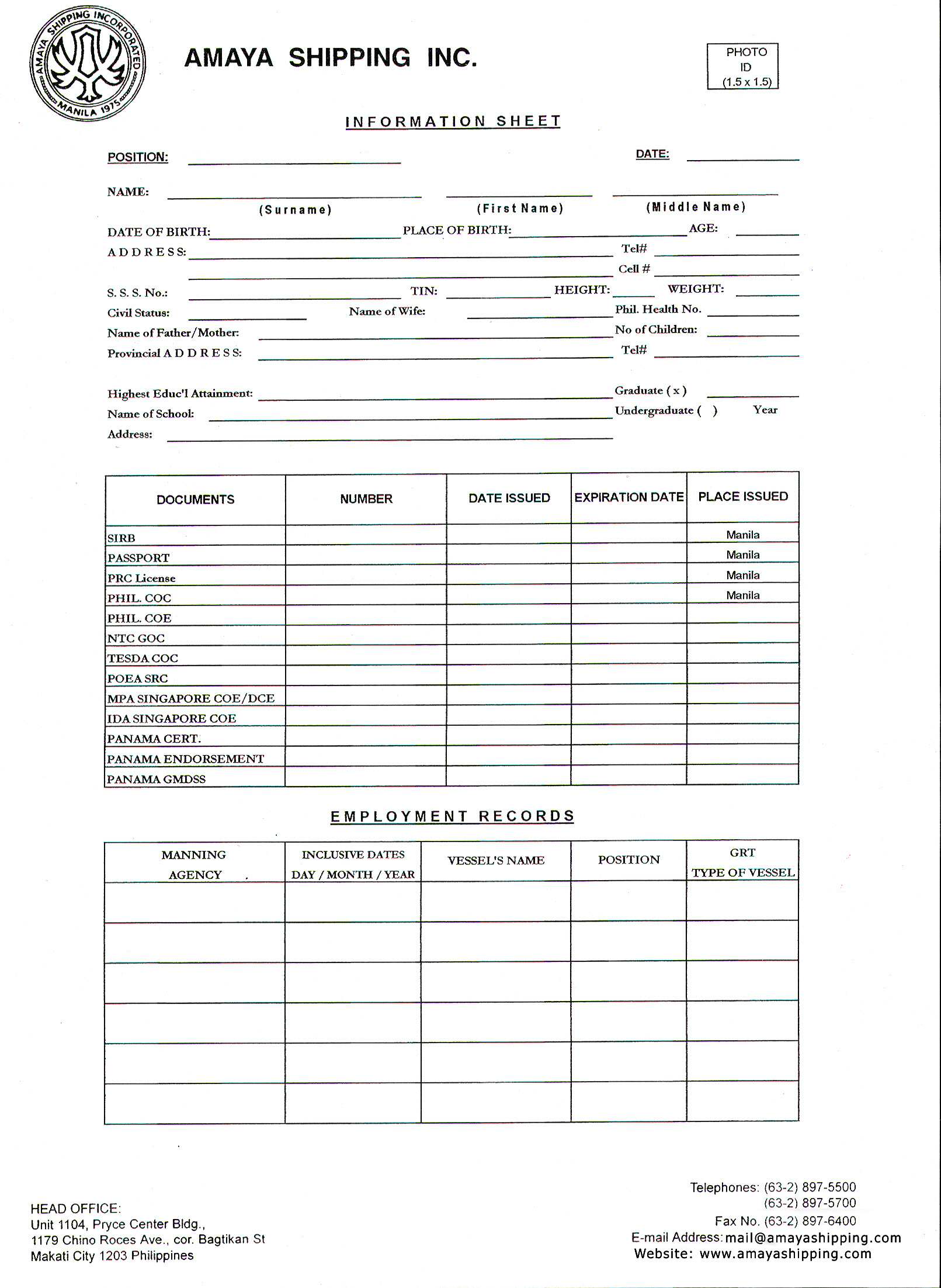 Send us your resume and your information sheets through mail@amayashipping.com |